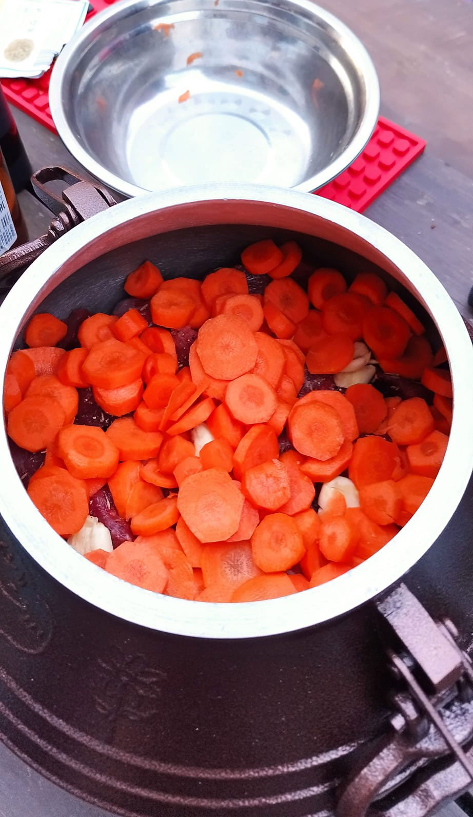 Послойно выкладываем ингредиенты. Подушка из лука (полукольцами). Мясо крупными кусками (соль, перец, зира, шафран). Чеснок. Морковь крупными кольцами (лаврушка). Томат крупными дольками. Болгарский перец полосками. Картофель дольками (соль, копченая паприка). Добавляем литр воды.