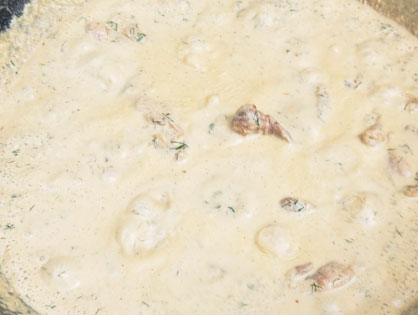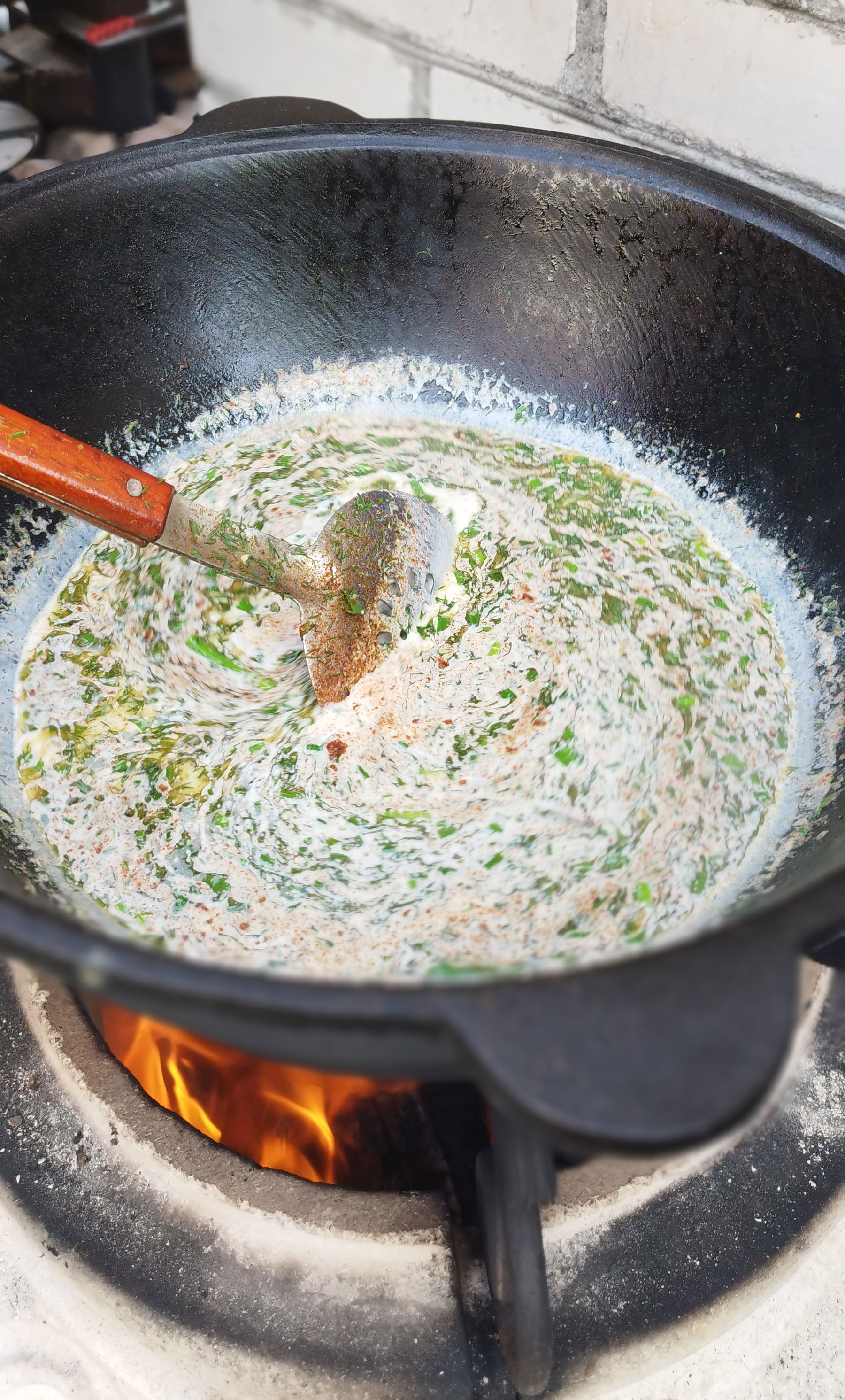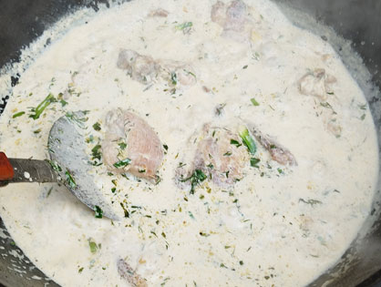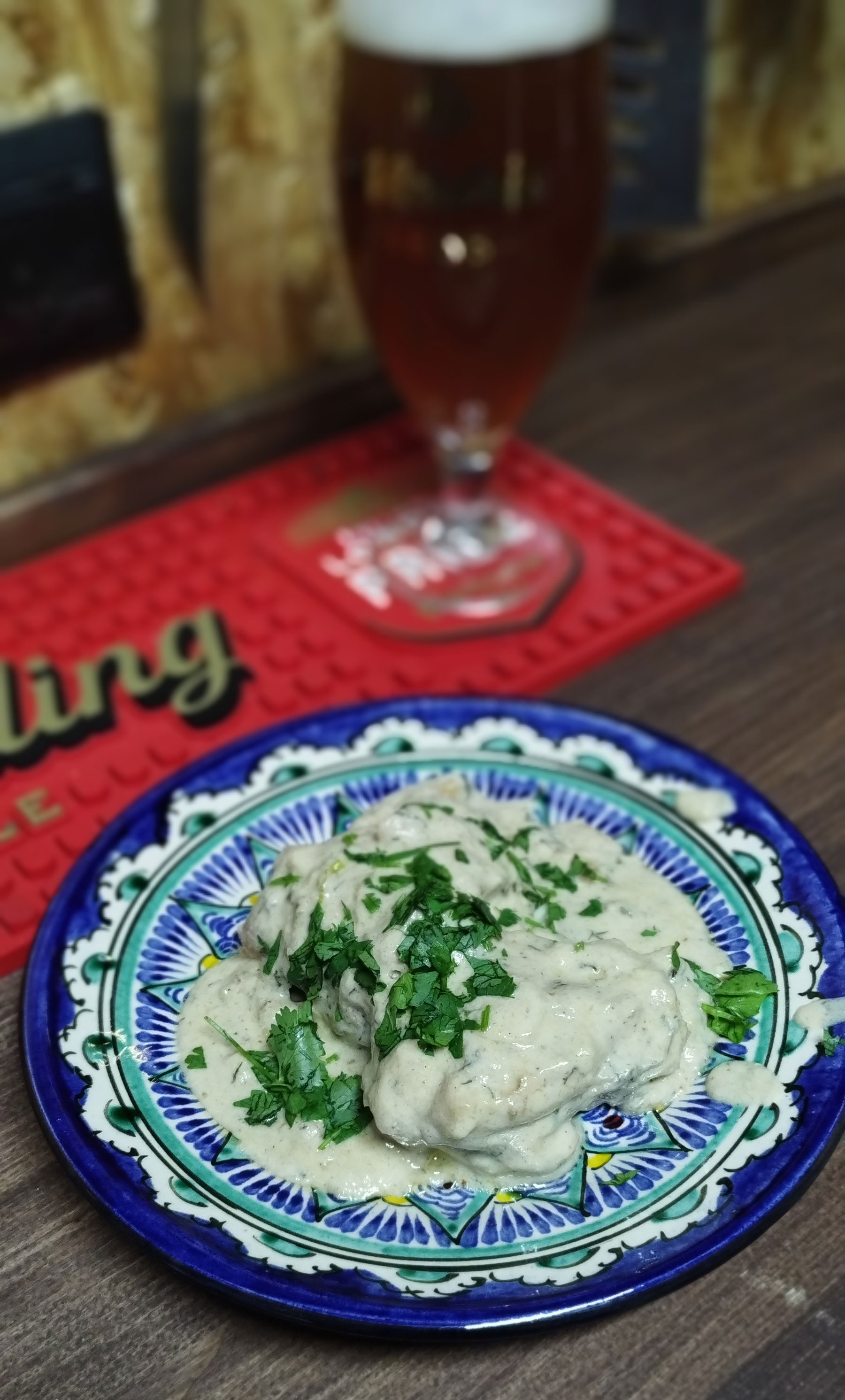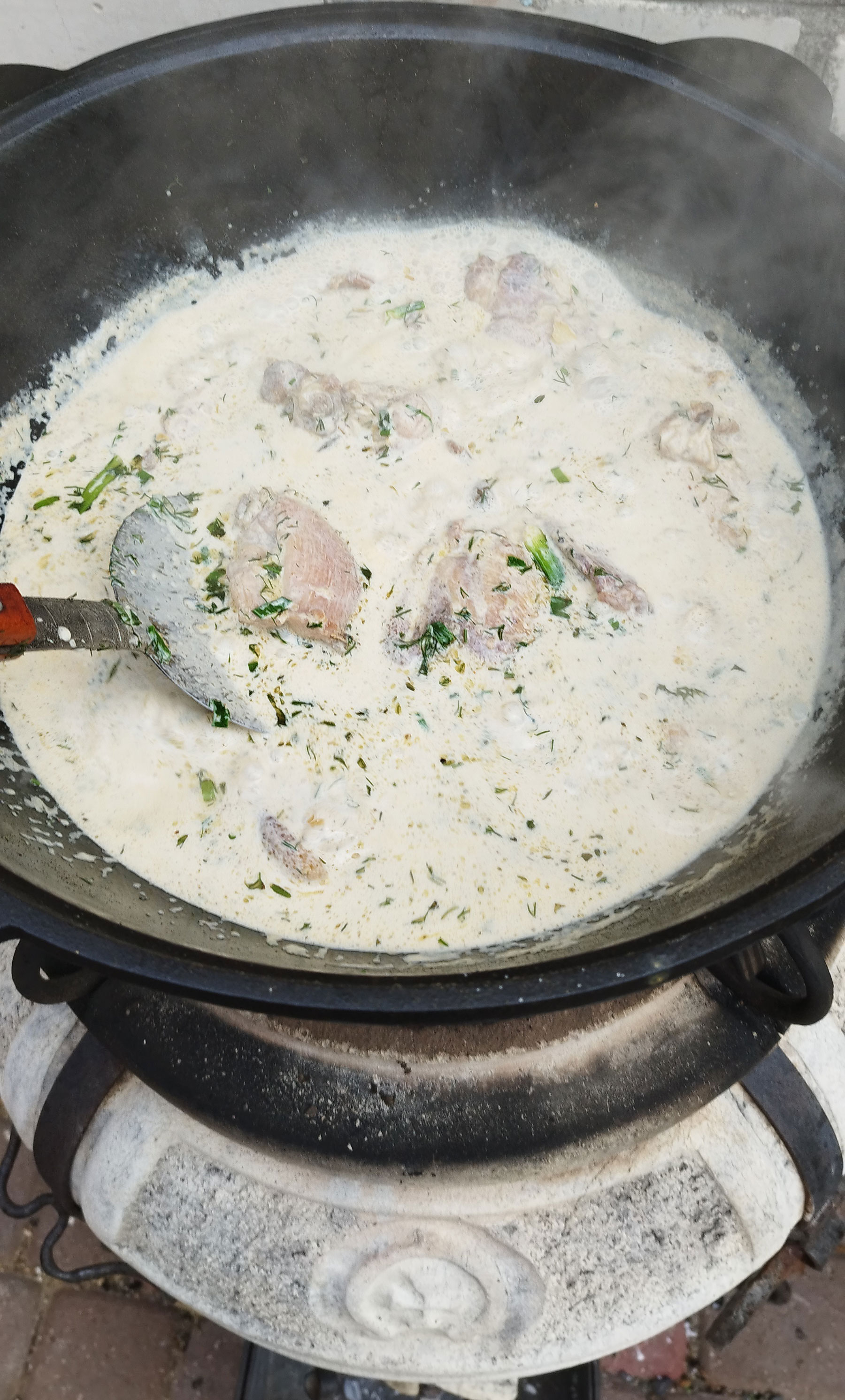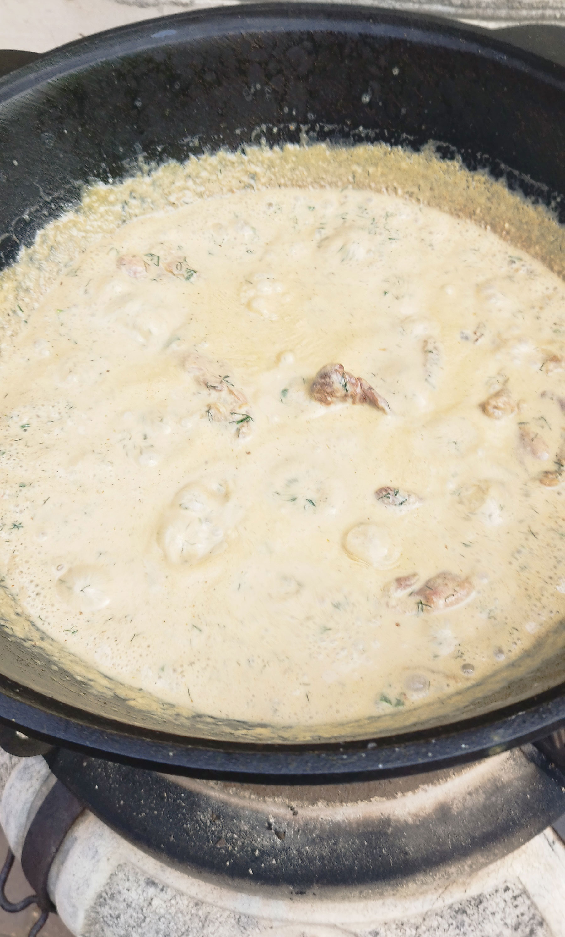 Жарим бедра на большом огне, достаем. Чуть обжариваем чеснок, добавляем сливки. Затем зелень без кинзы, присаливаем, копченая паприка, хмели-сунели. После запипания возвращаем курицу. Томим на малом огне до загустения соуса.