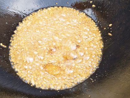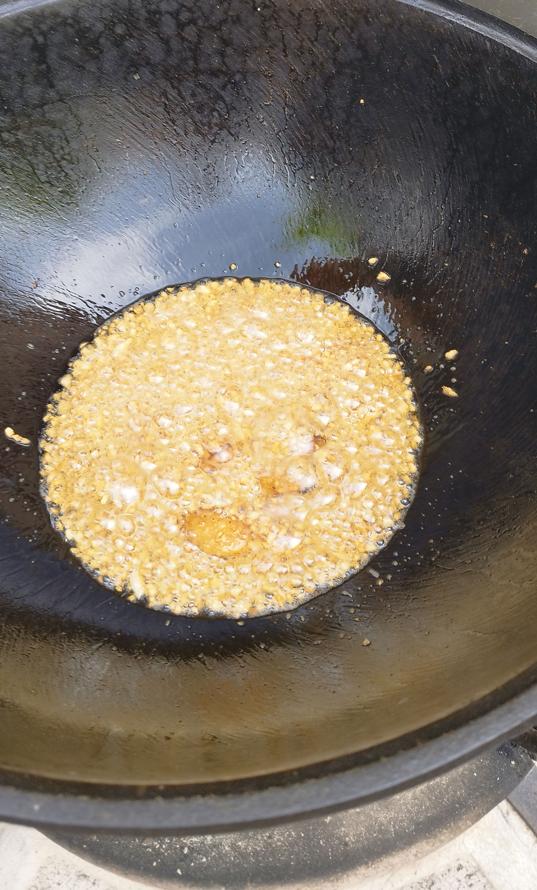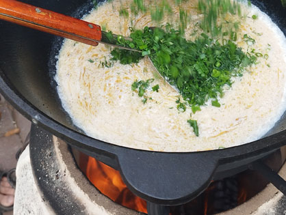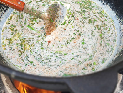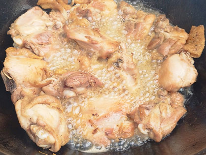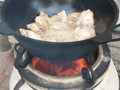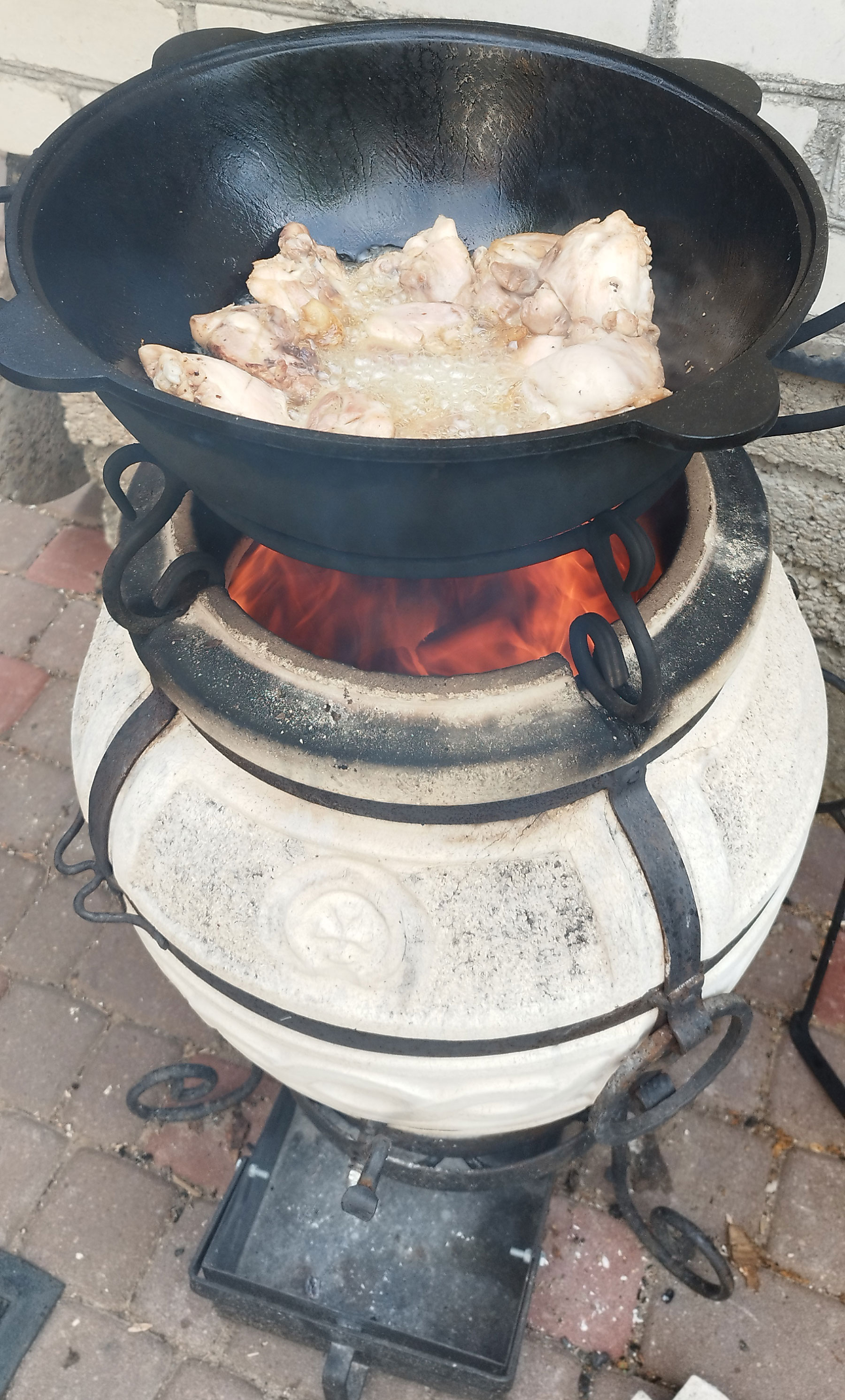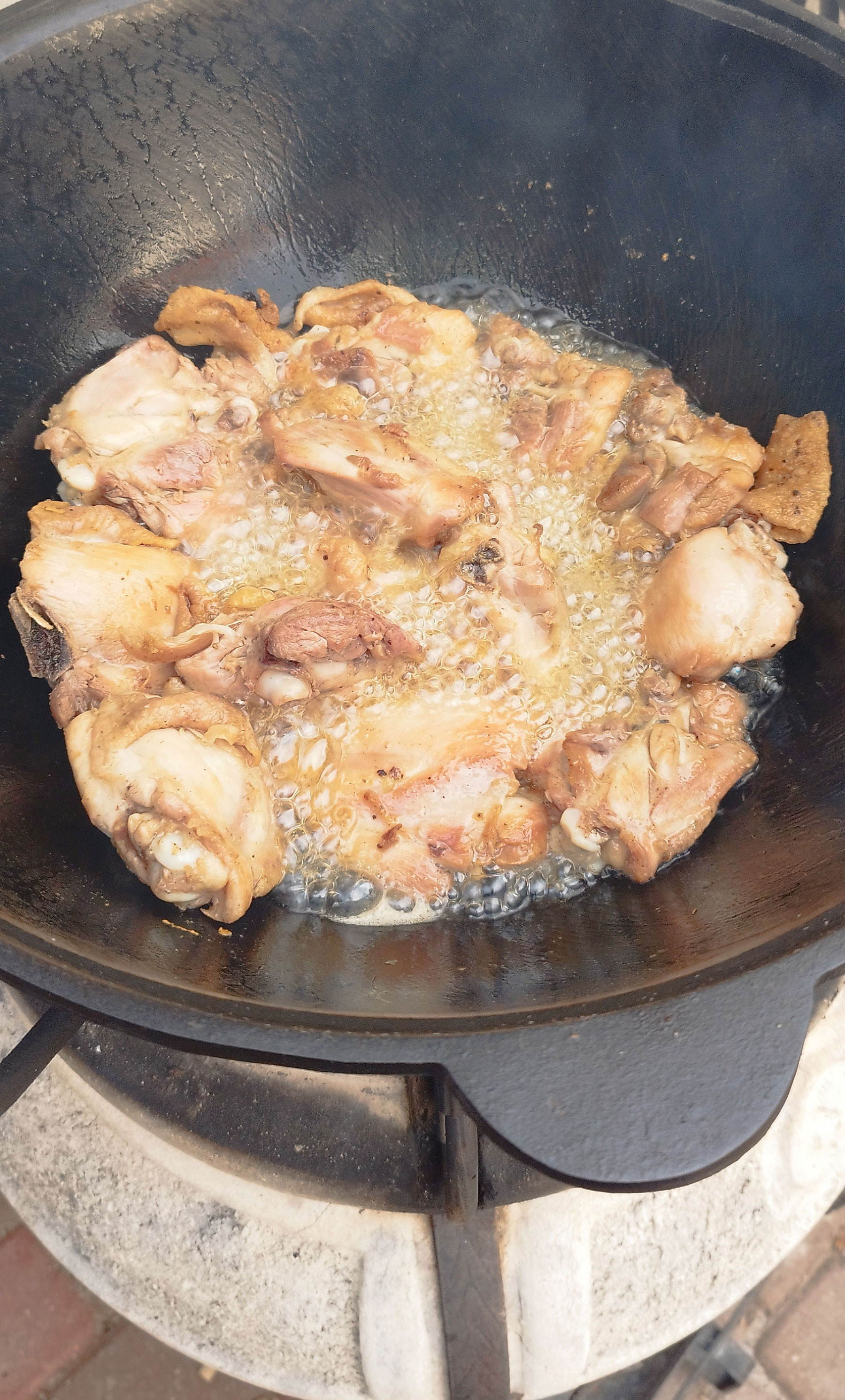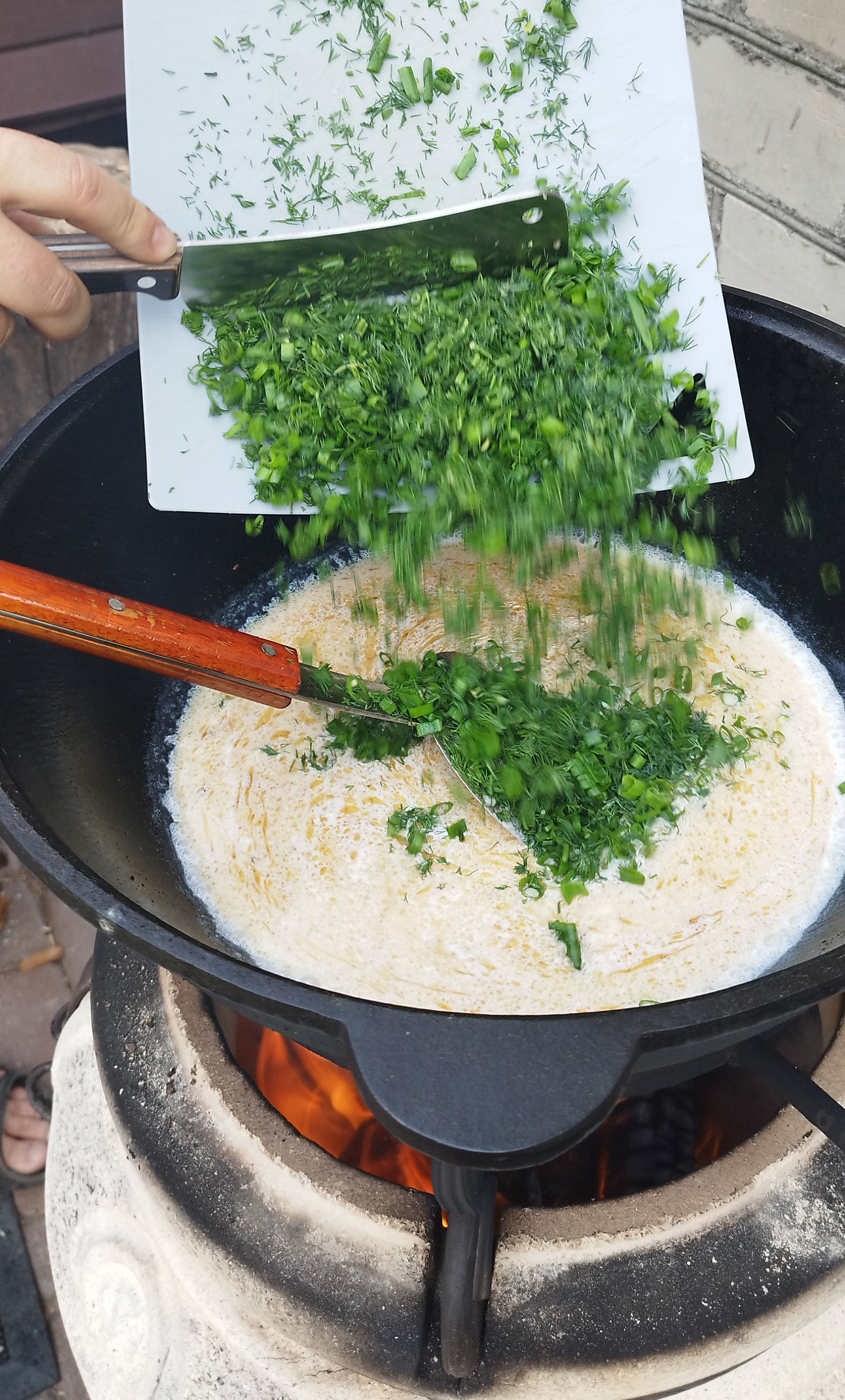 Жарим бедра на большом огне, достаем. Чуть обжариваем чеснок, добавляем сливки. Затем зелень без кинзы, присаливаем, копченая паприка, хмели-сунели. После запипания возвращаем курицу. Томим на малом огне до загустения соуса.