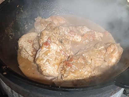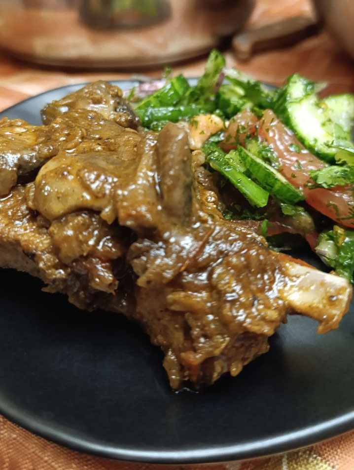 Добавляем немного масла и запечатываем мясо. Солим, перчим, зира, копченая паприка, хмели-сунели. Добавляем лук. Как лук начнет растворяться, добавляем томаты. Тушим под крышкой. Когда подлива начнет выпариваться, добавляем грибы. Подтушиваем все вместе 10-15 минут под крышкой.
