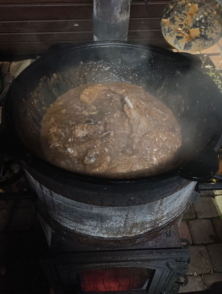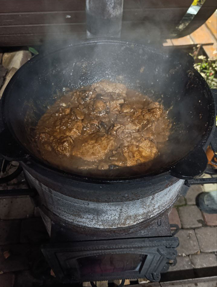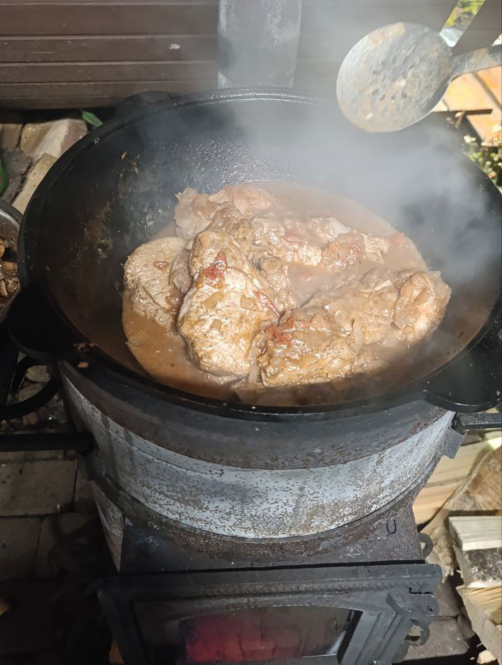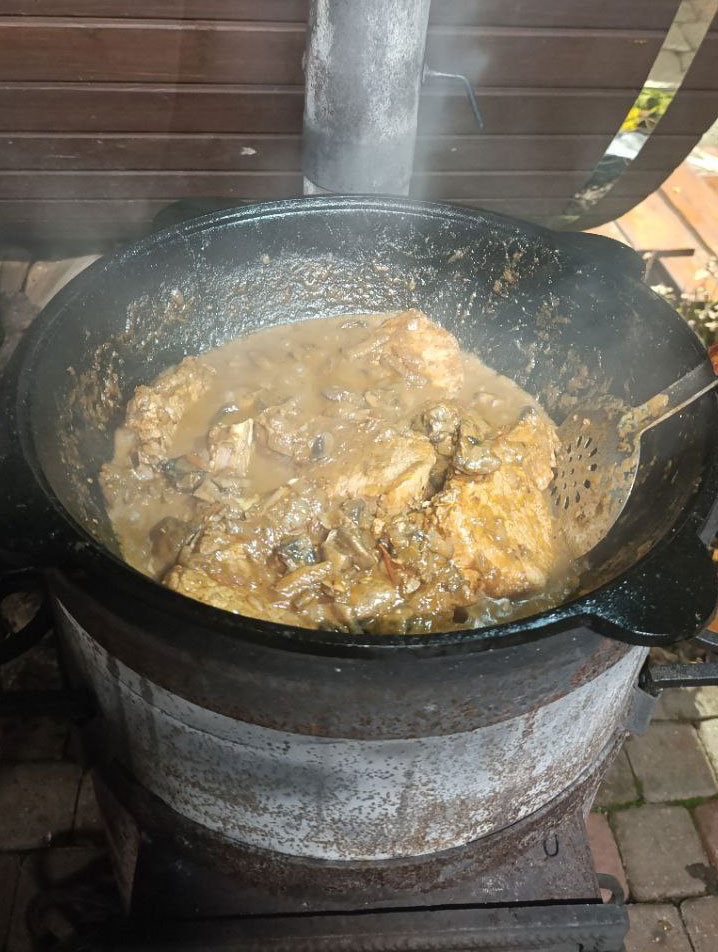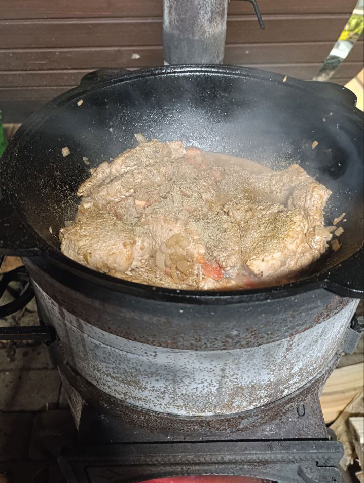 Разогреваем казан и добавляем подсолнечное масло. Добавляем картофель чуть не дожариваем. Солим, добавляем копченую паприку. Снимаем с казана.