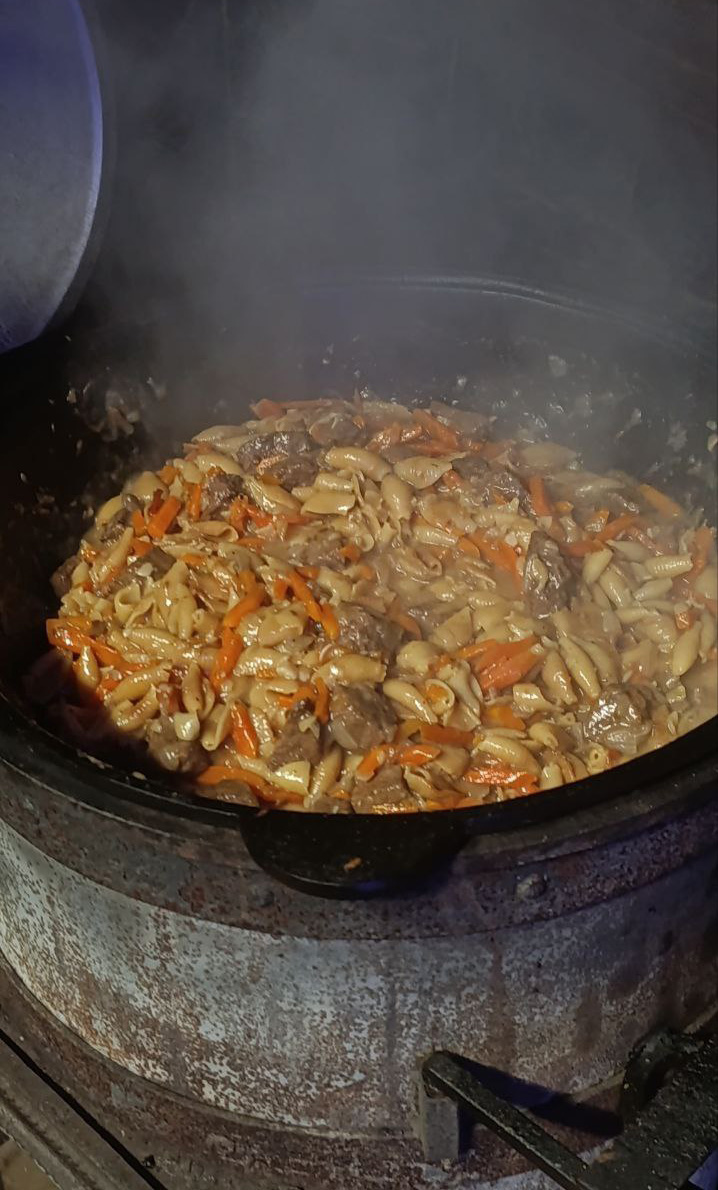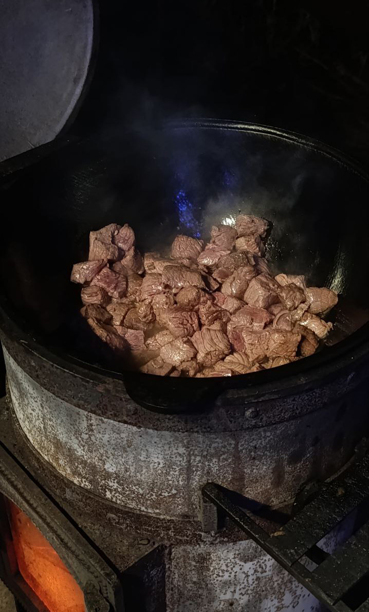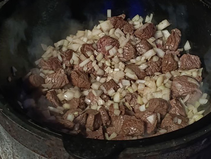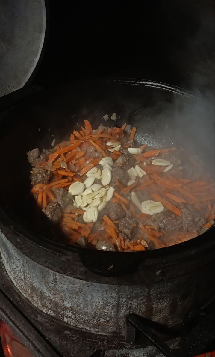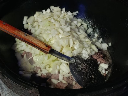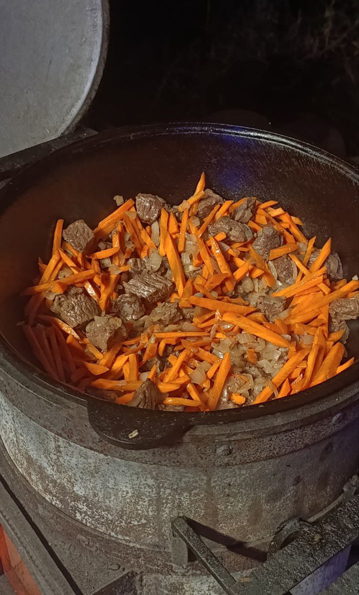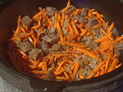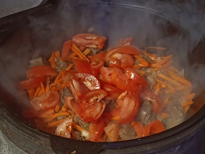 Заворачиваем мясо на большом огне, солим, перчим. Уменьшаем огонь и добавляем лук. Чуть позже морковь, зира, томаты. Тушим мясо.