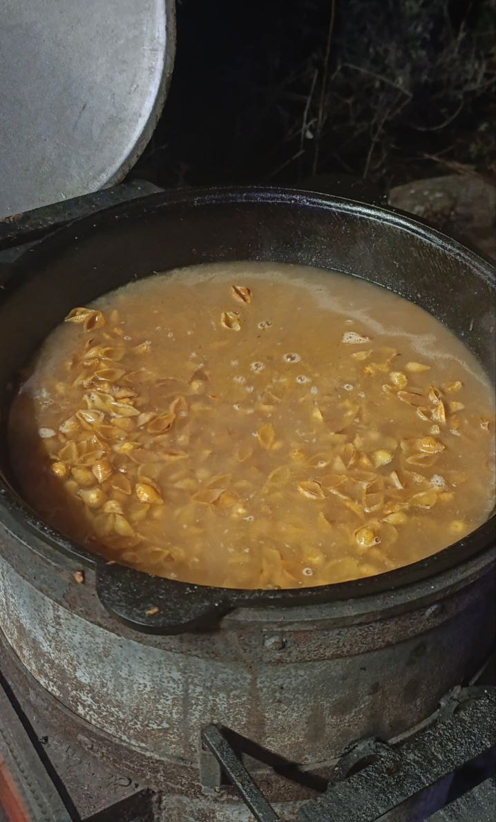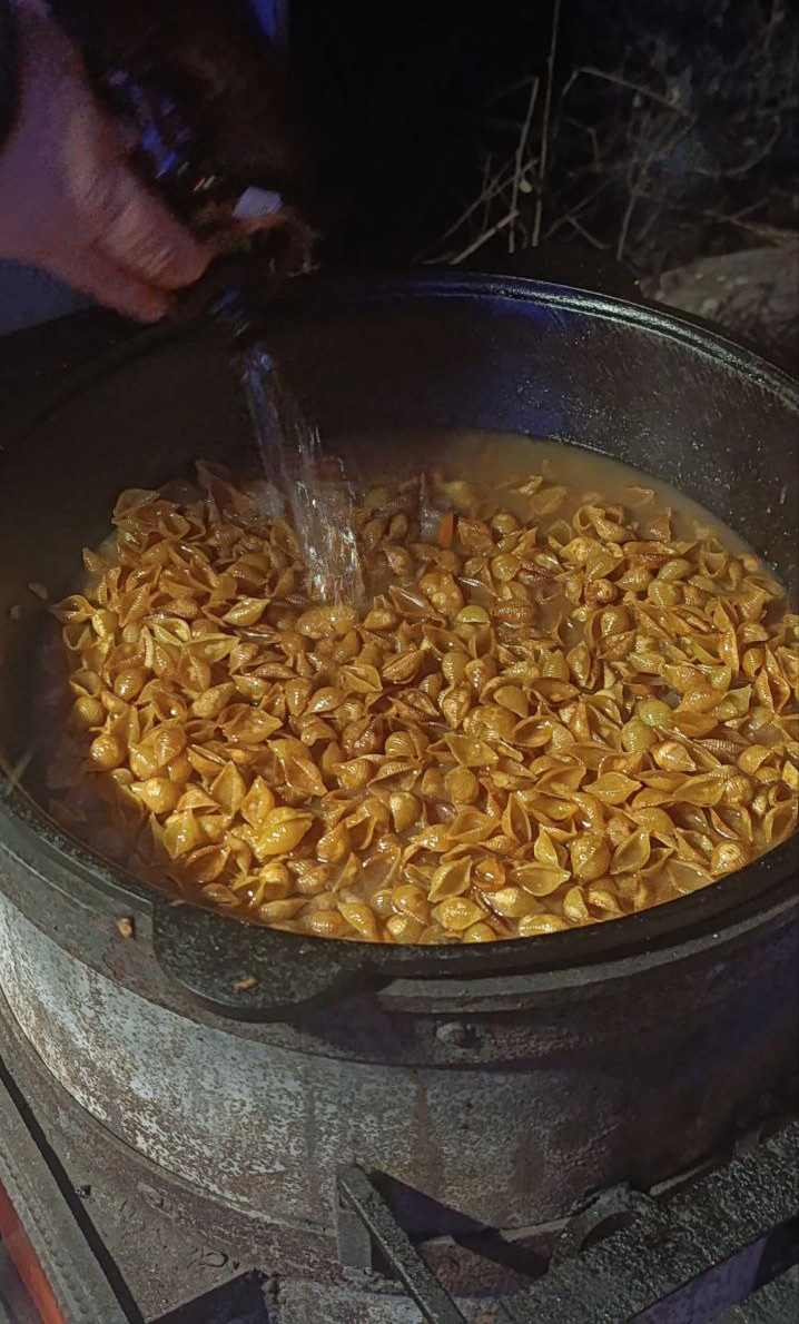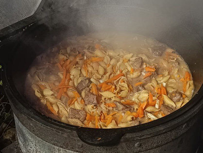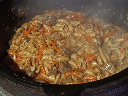 Готовое мясо засыпаем обжаренными макаронами. Присаливаем и заливаем (водой) так, чтобы жидкость покрыла макароны. Накрываем крышкой и выпариваем воду.