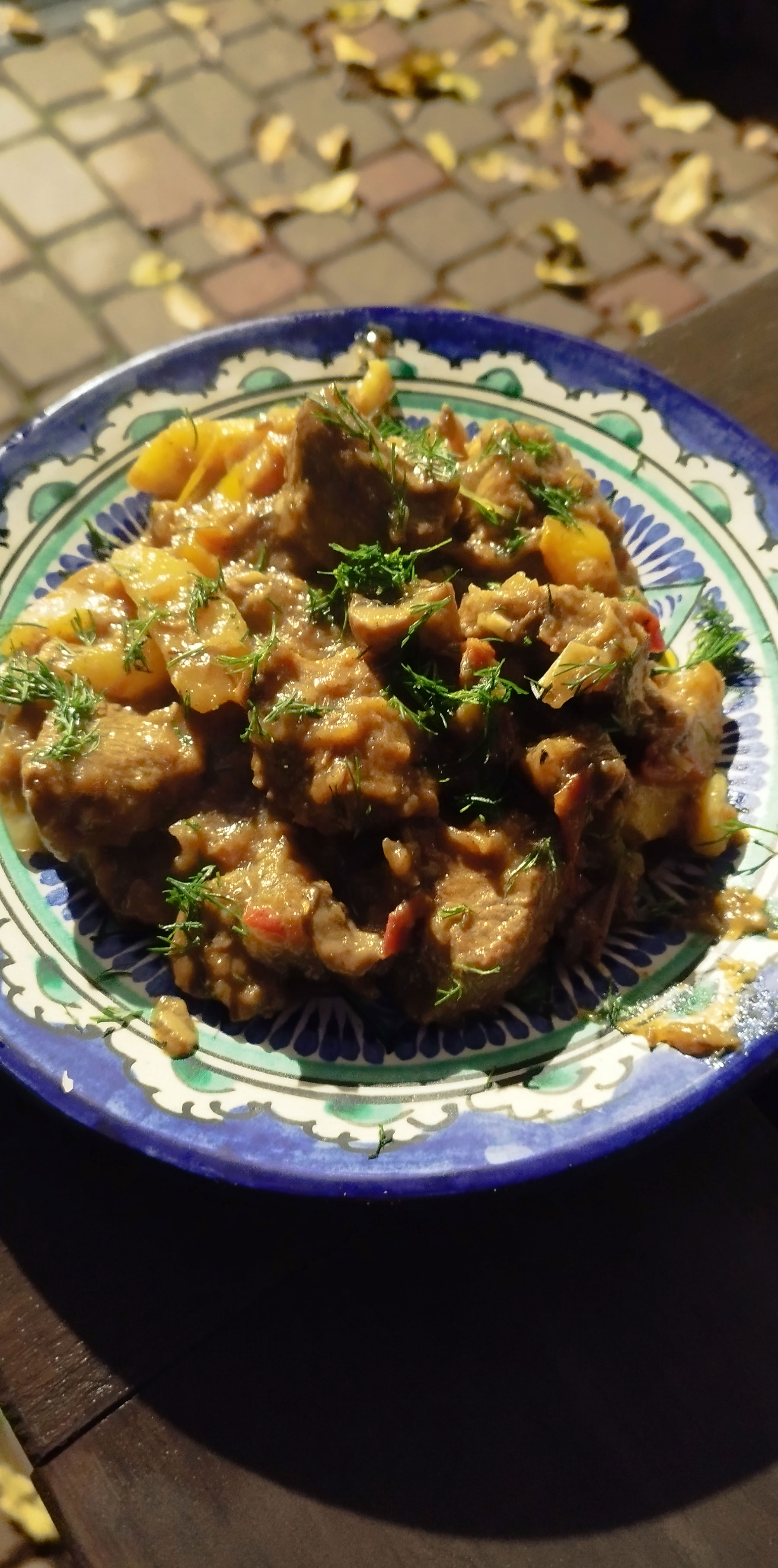 Добавляем немного масла и запечатываем мясо. Добавляем лук. Как лук начнет растворяться, добавляем томаты. Тушим под крышкой. Добавляем перец. Когда подлива начнет выпариваться, добавляем грибы и картофель. Подтушиваем все вместе 10-15 минут под крышкой.