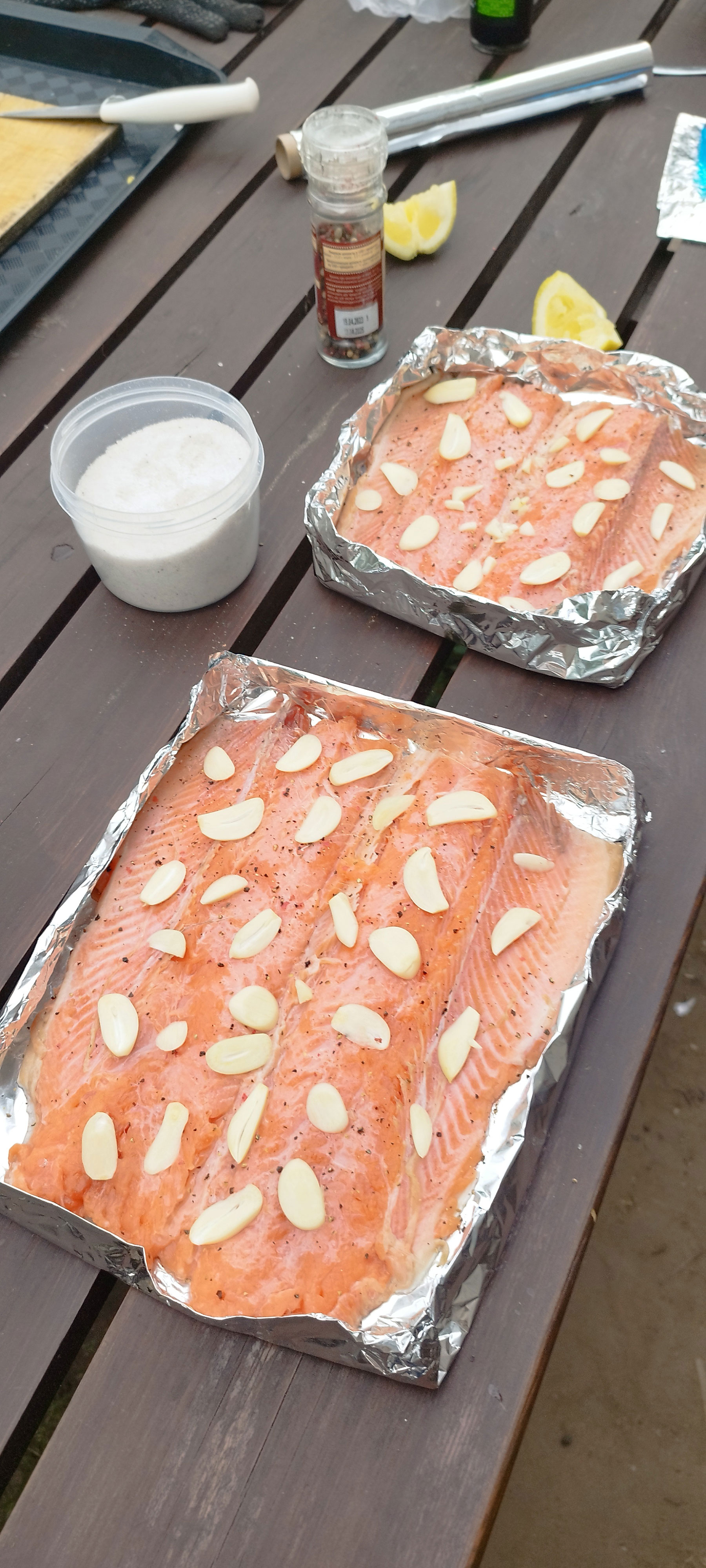 Разделываем тушки на филе. Даем подсохнуть. Солим, перчим. Сбрызгиваем соком лимона. Режем чеснок полосками и выкладываем на рыбу.