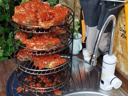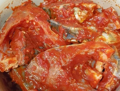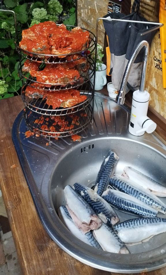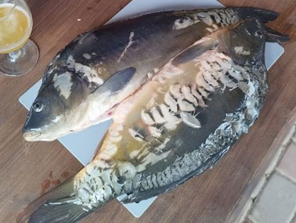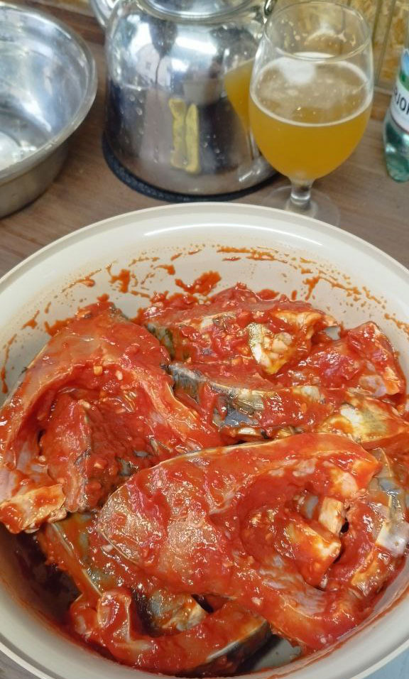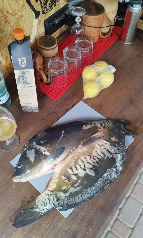 Смешиваем масло с пастой и медом, добавляем измельченный чеснок, копченую паприку, выдавливаем сок лимона, солим. Нарезаем карпа на стейки и смешиваем с соусом.