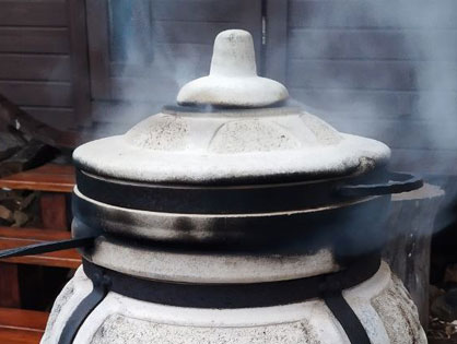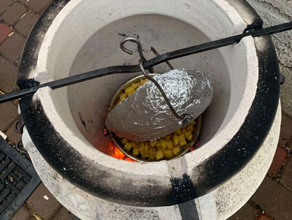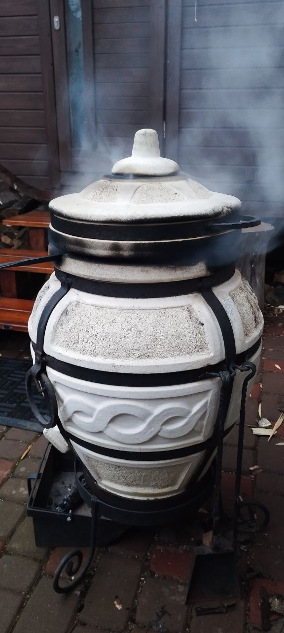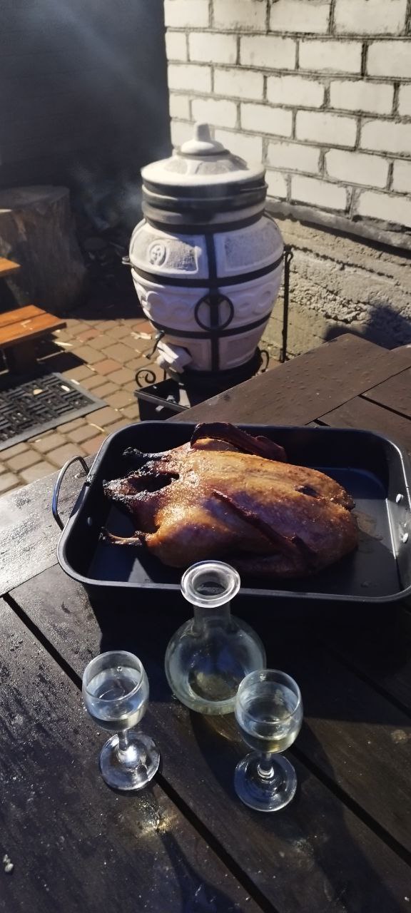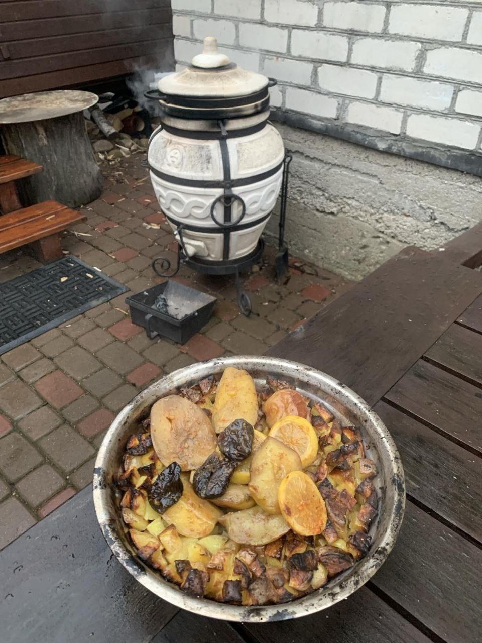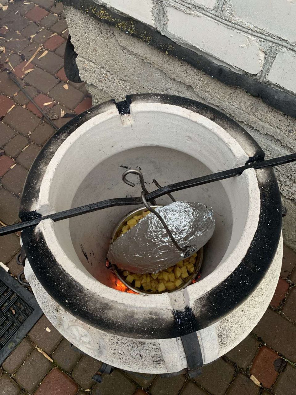 Миску с картофелем на дно. Утку на крюк. Час запекаем в фольге. Достаем картофель. Снимаем фольгу, смешиваем мед с соевым соусом и смазываем утку. Возвращаем в тандыр на пол часа. Температура готовности 60-65°С.