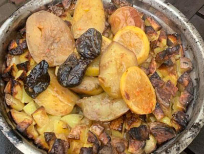 Утку солим перчим, набиваем нарезанными яблоками, наверх укладываем кольца апельсина и чернослив. Заворачиваем в фольгу. Картофель кубиками с чесноком и солью. Добавляем растительное масло.