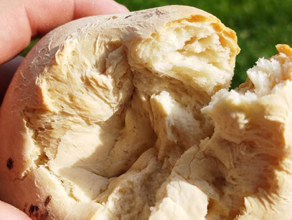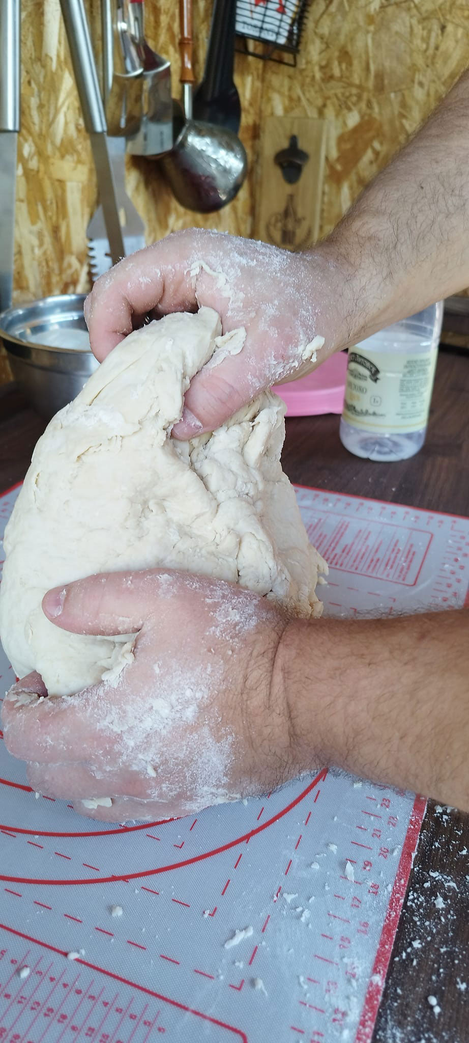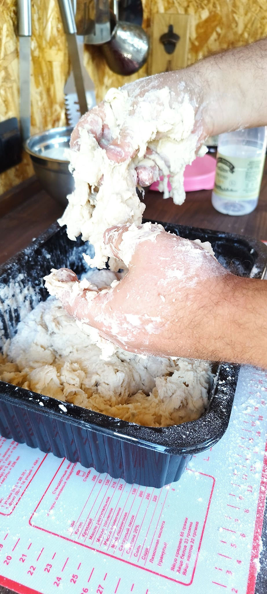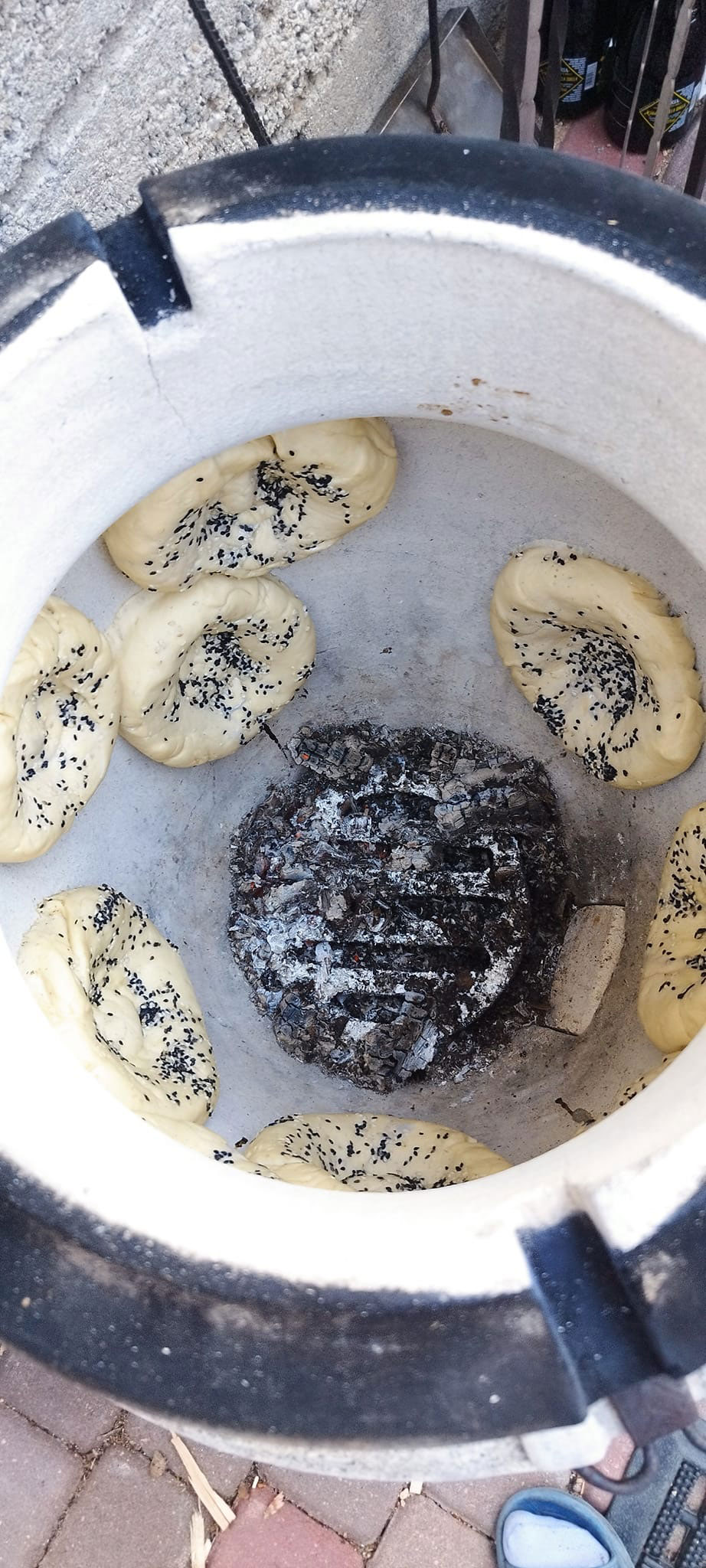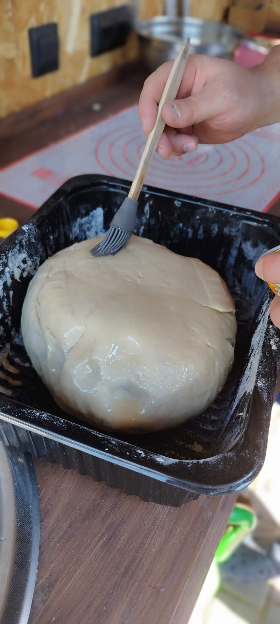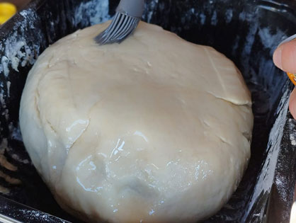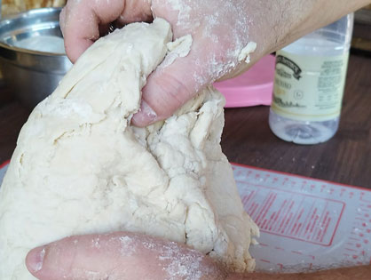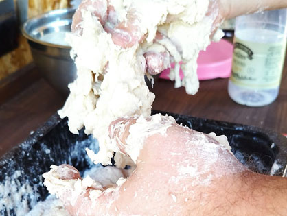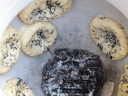 Через час делаем заготовки для лепешек. Разделяем тесто на две части. Одну часть убираем к емкость, из второй делаем колбаску и разрезаем ее на пять частей. Из каждой части делаем колобки. Готовые колобки накрываем полотенцем. Повторяем процедуру со второй частью теста. Достаем одну заготовку, формируем лепешку: по середине должно быть тонко, по краям толсто. Ставим узорчатые печати по центру. Убираем лепешку на коврик посыпанный мукой. Повторяем процедуру.