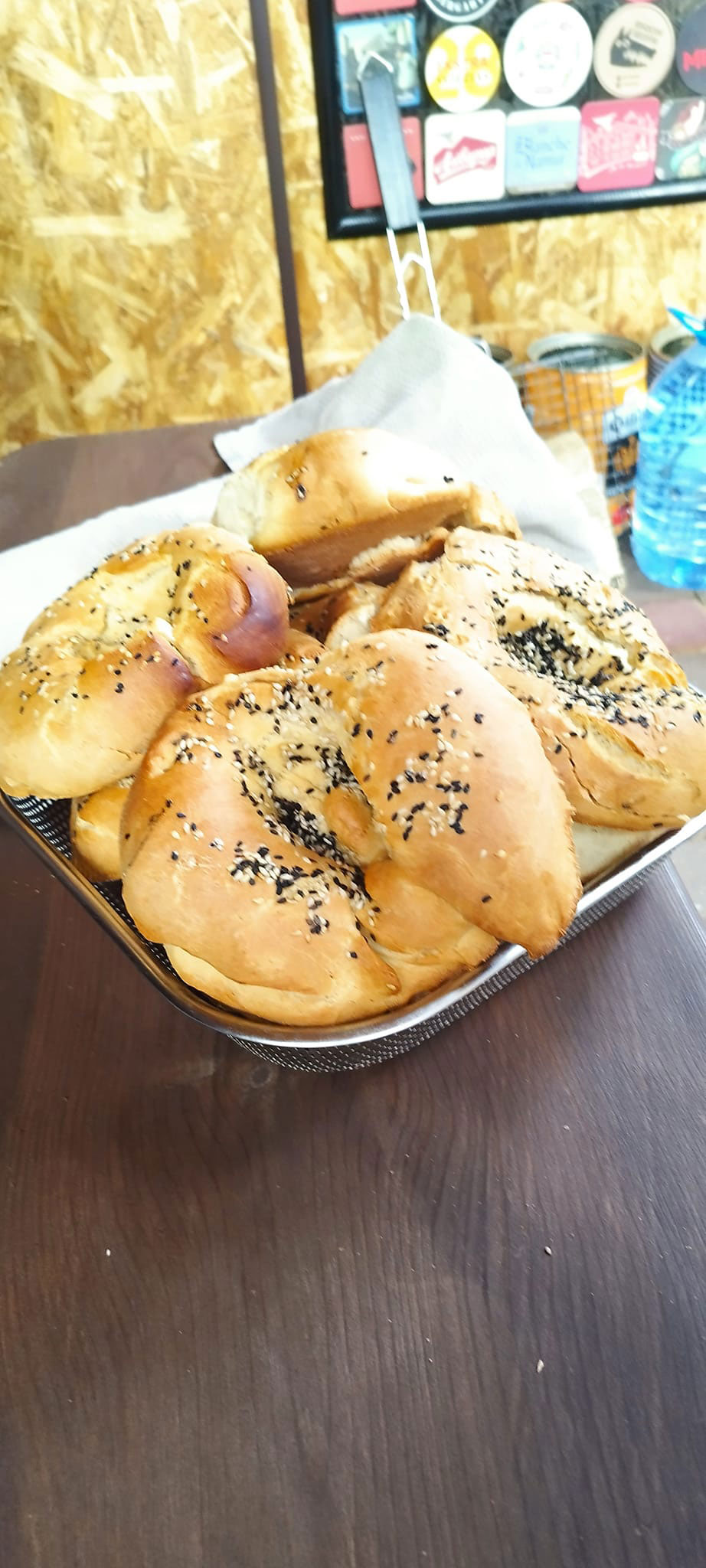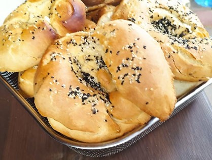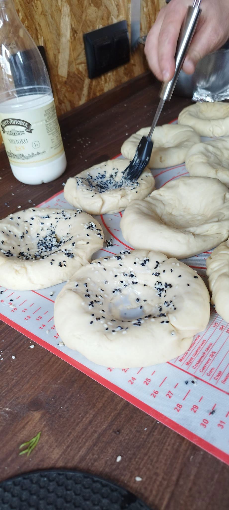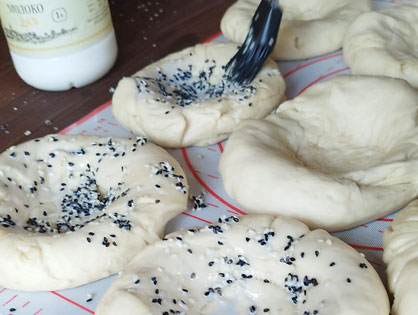 Смешиваем кунжут с молоком и смазываем верх лепешек кисточкой.
