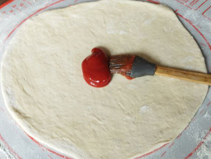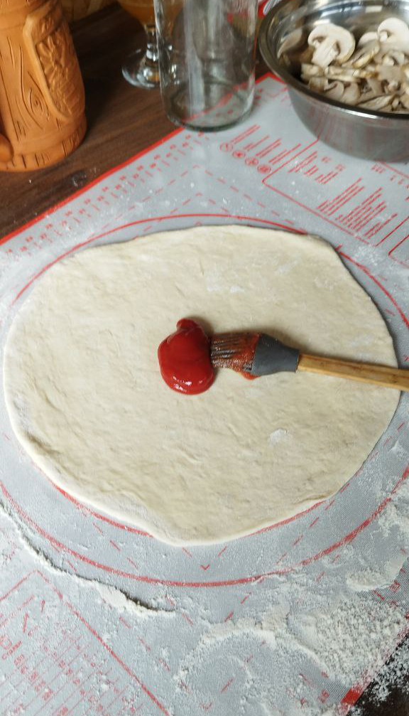 Раскатываем тесто тонким слоем, смазываем томатной пастой, выкладываем мясные нарезки, помидоды, маслины, шампиньоны. Посыпаем тертым сыром. Подворачиваем края.
